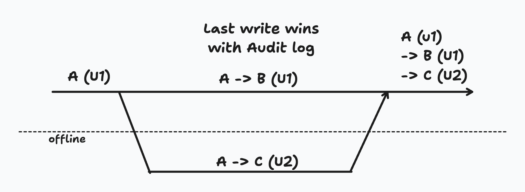 This approach trades off a user-facing capability (making changes while offline) for operational simplicity (no conflicts possible).