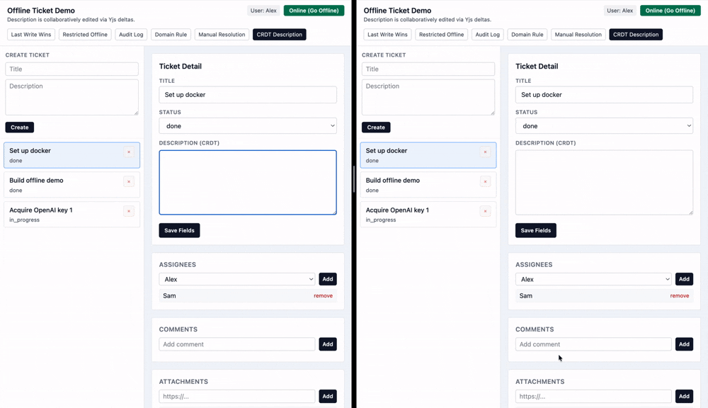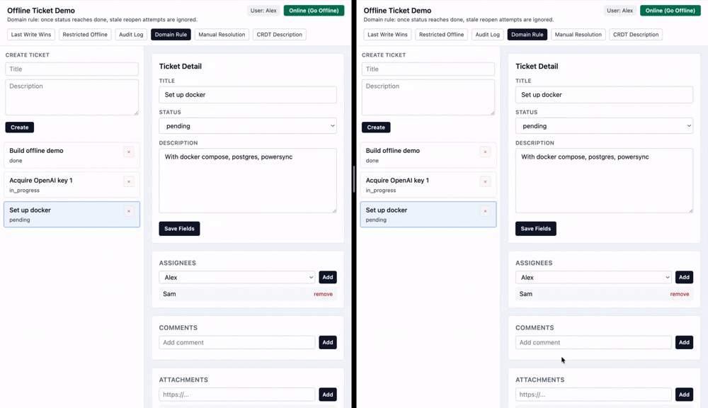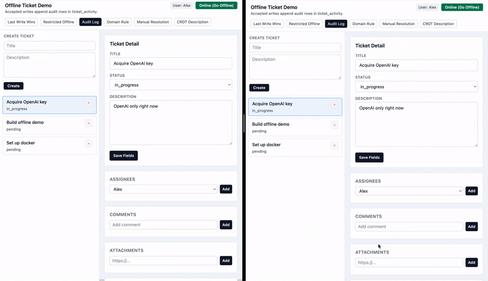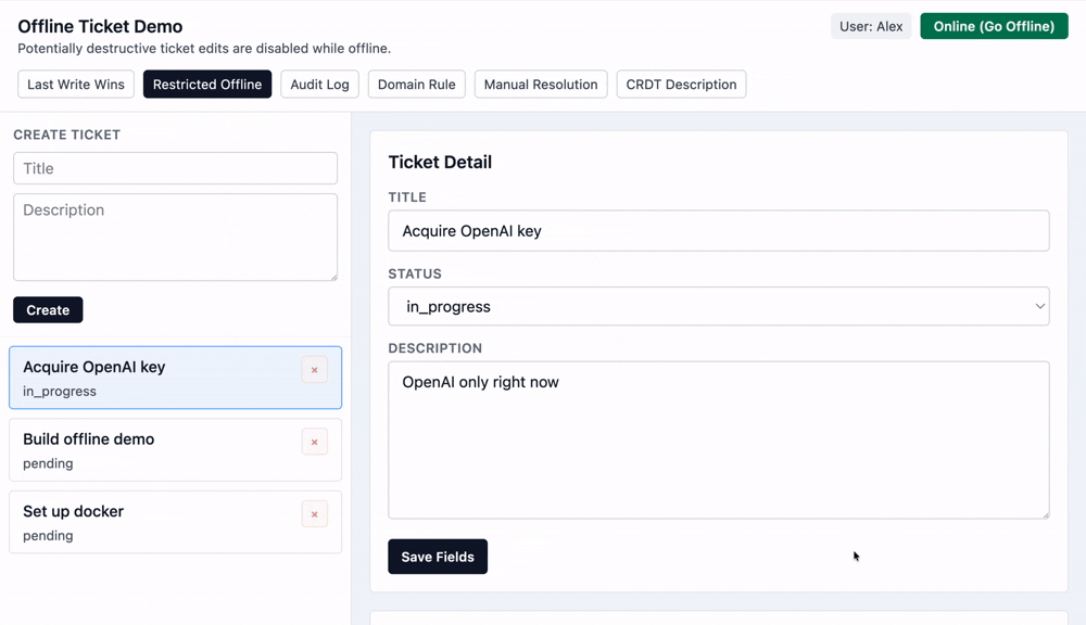 Let's imagine while I am offline, someone changes this ticket from pending to done. But since I was offline, I didn't see that change. I separately change the status from pending to in progress.
